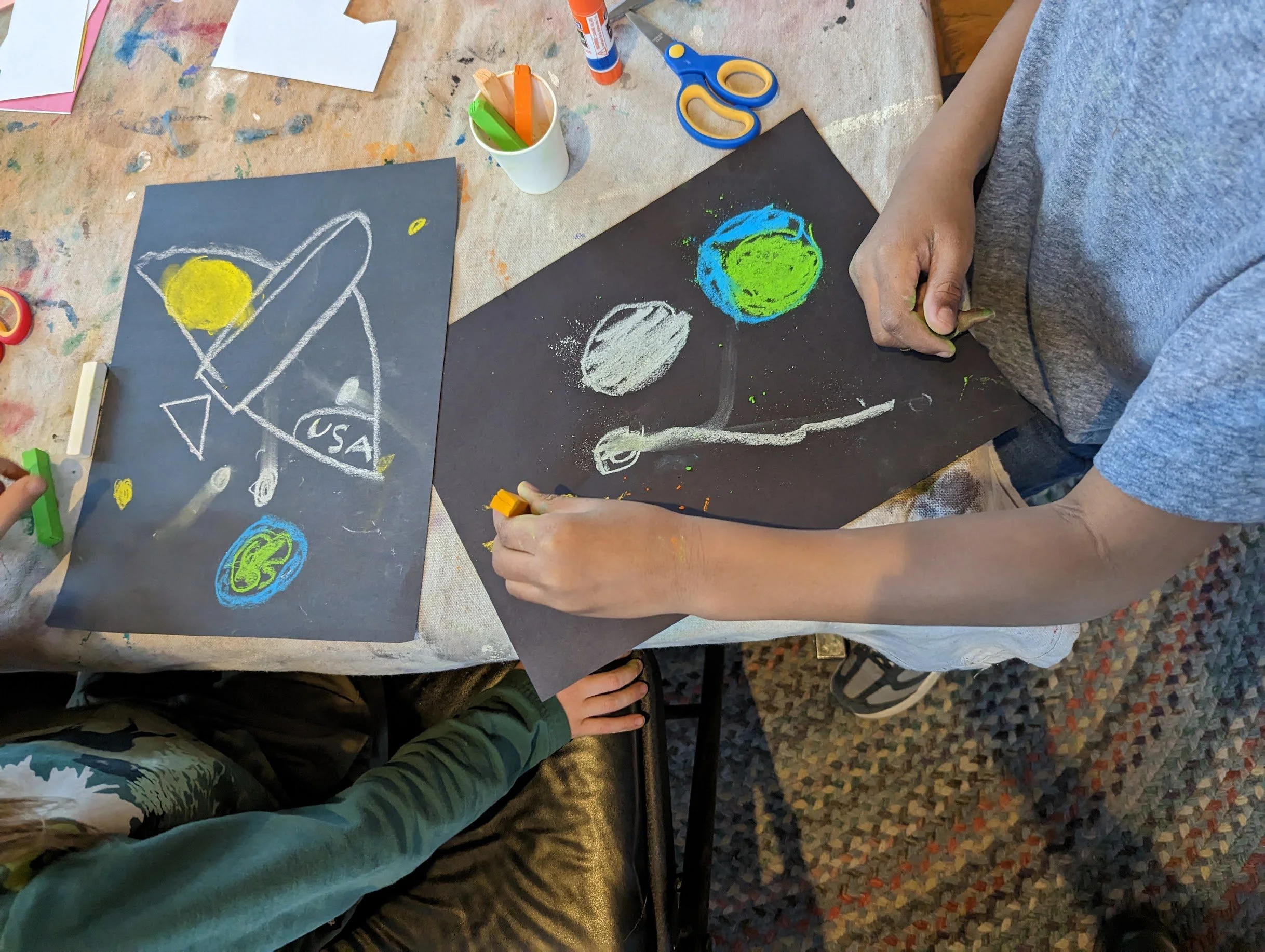 Beads with large holes, embroidery thread, yarn, tempera paint, child-size paintbrushes, watercolor paper, chalk, white glue bottles, glue sticks, pencils, oil pastels, colored pencils, construction paper, and printer paper.